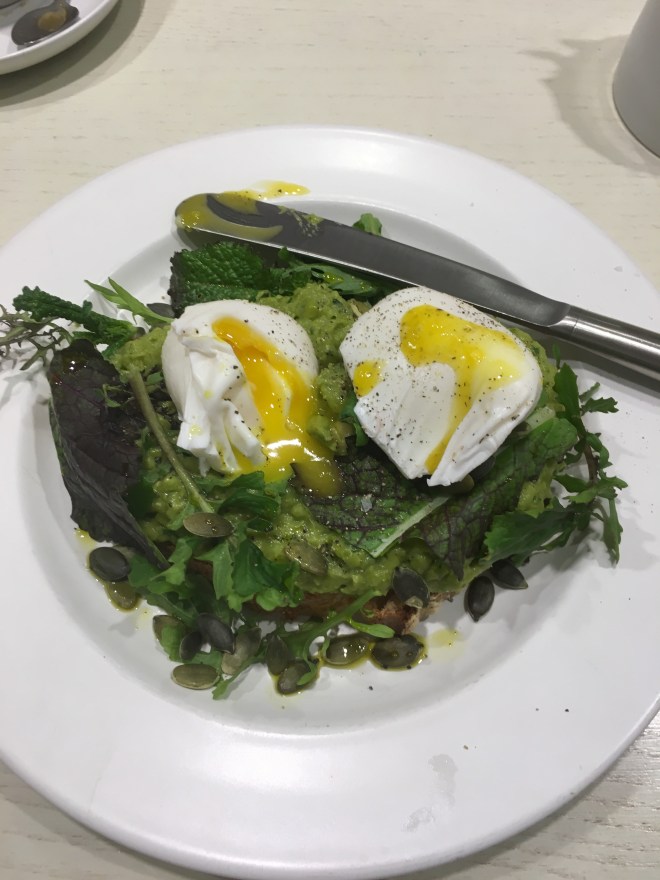 I went for the pea & avocado on sourdough. Delicious! I find the pea really lightens up the dish, then when you add in the herbs and pumpkin seeds I definitely felt like I had made a healthy choice.