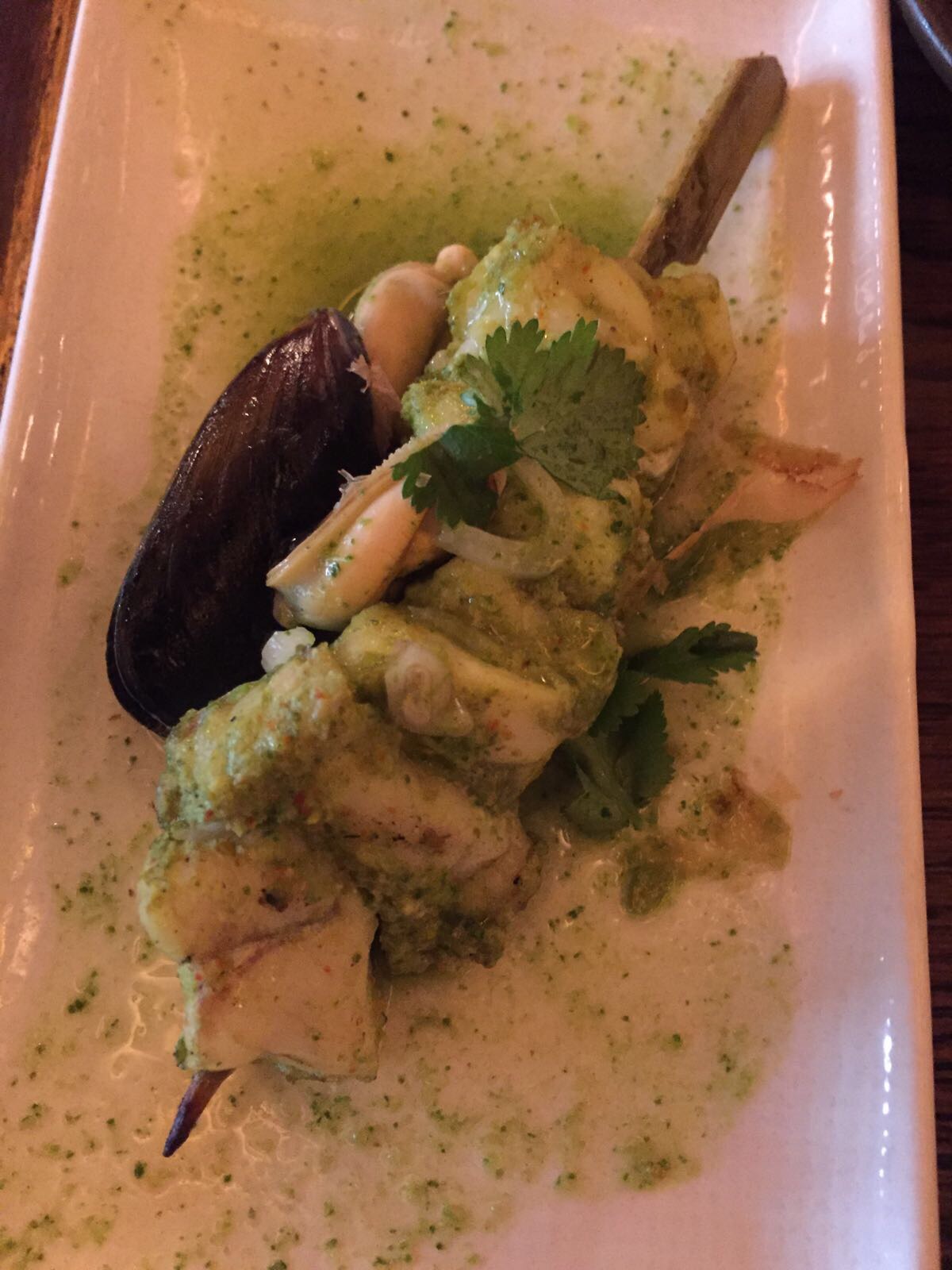 Monkfish skewers- this comes as one fat skewer. Nicely cooked and still big enough to share (which you’ve probably worked out, I am all about). 2 little mussels which tasted lovely, I could have had a dish of them in the sauce