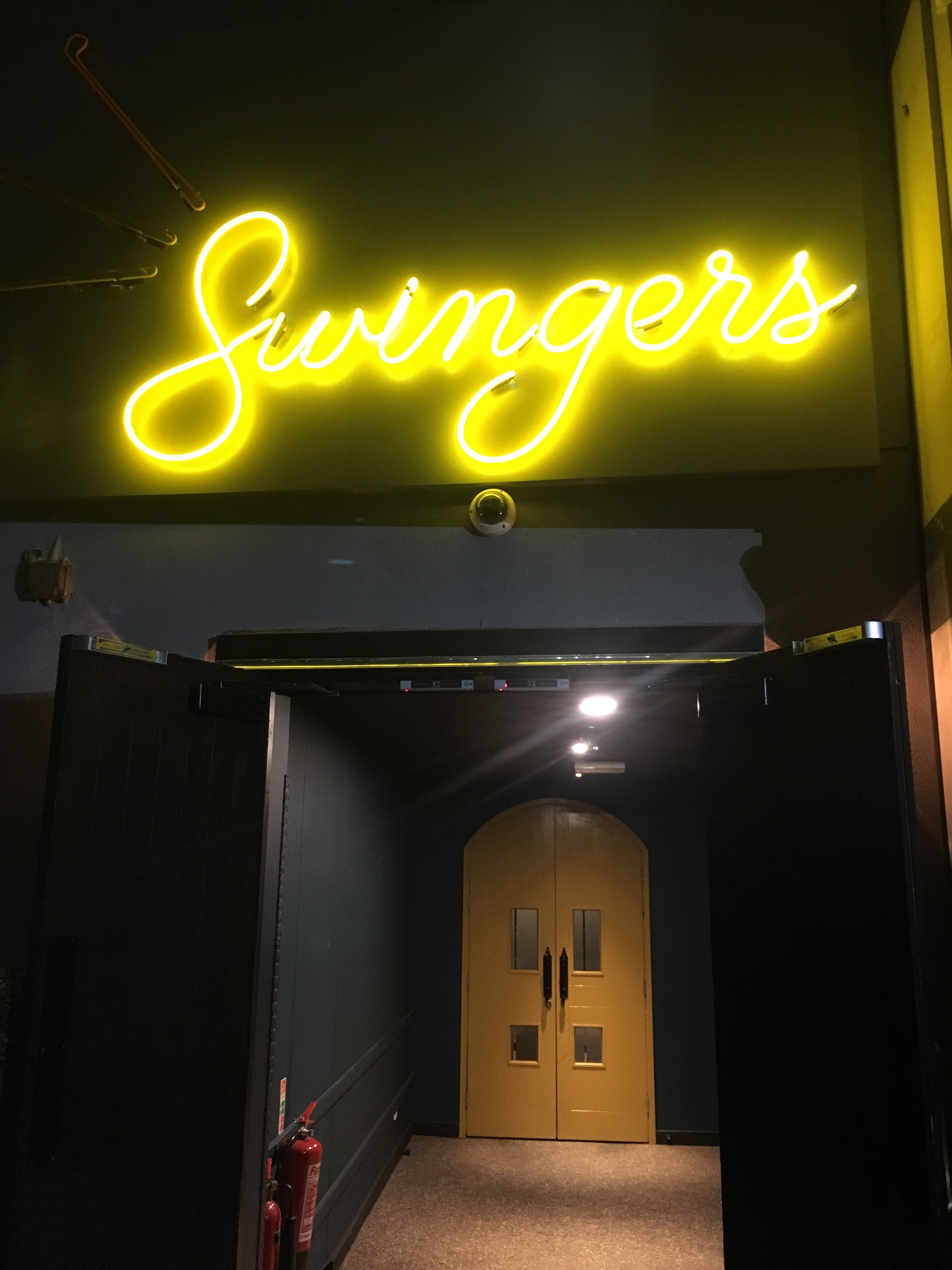 Tucked under ground near The Gherkin you’ll find Swingers. 2 courses, a nice bar and some food stalls makes it a one stop shop for a good night out.
