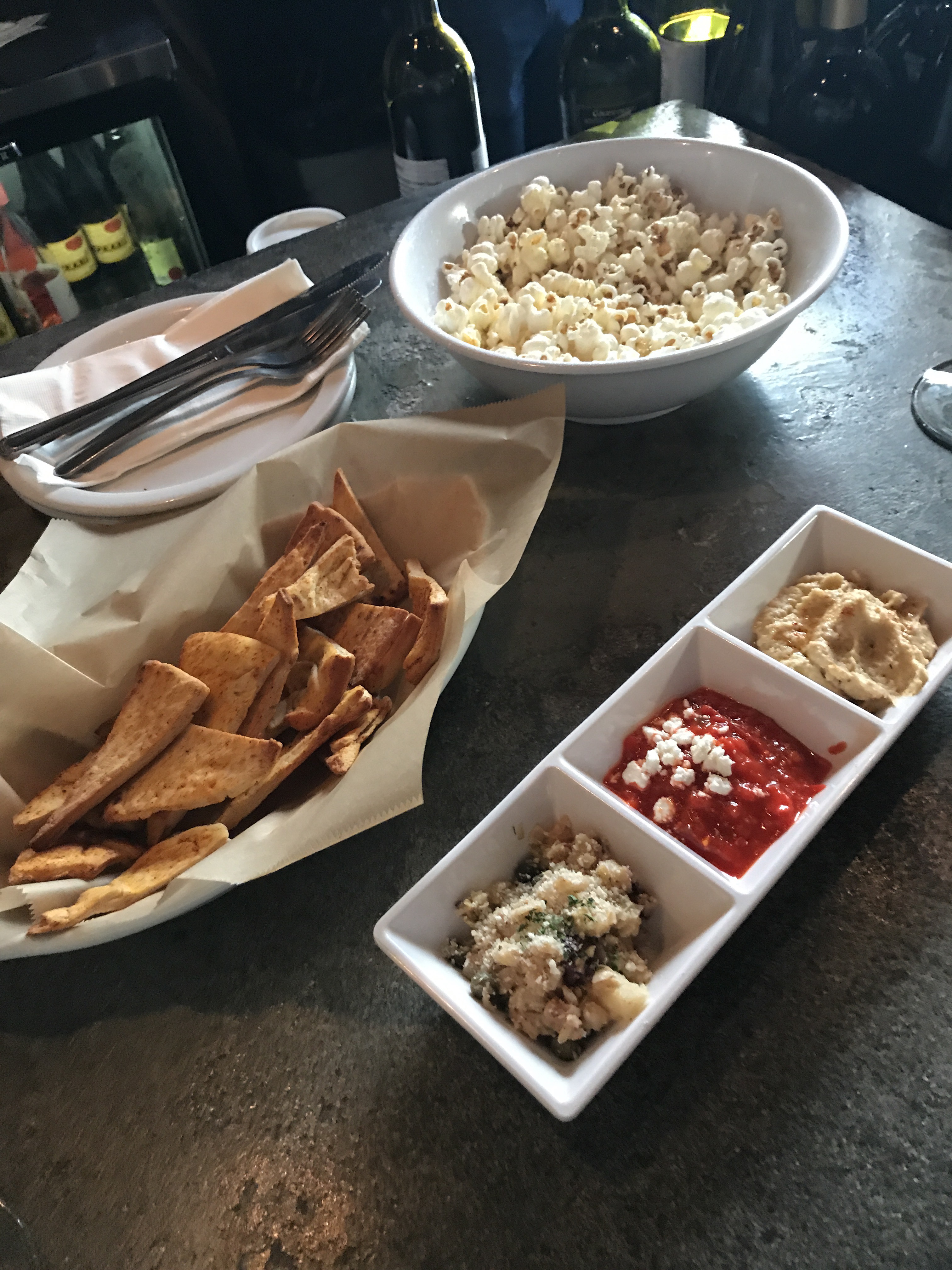 So in comes Pour Haus. It’s a “small” (LA small, London big) wine bar that is doing things a little different. So how is it different? They have shelves and shelves of wine out of which you can buy to take away, drink in or by the glass. You can get any wine by the glass and it’s just 1/4 the bottle price! Amazing right! Plus they are all sitting in an incredibly reasonable price range with a happy hour glass $5 and normal between $7-12. For LA, that is some good priced wine! Oh and they give you popcorn for while you are drinking – I’m a sucker for this sort of little free add on!