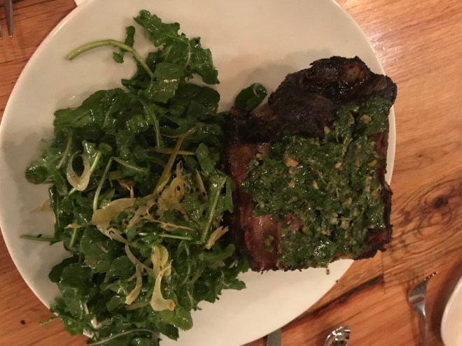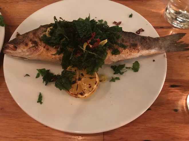 Branzino: whole fish stuffed with herbs. It’s not a fish I am familiar with but it was nicely done. Especially nice was it being deboned, it makes sharing much easier. Also nice, was my leftover fish tacos I had with it the next day.