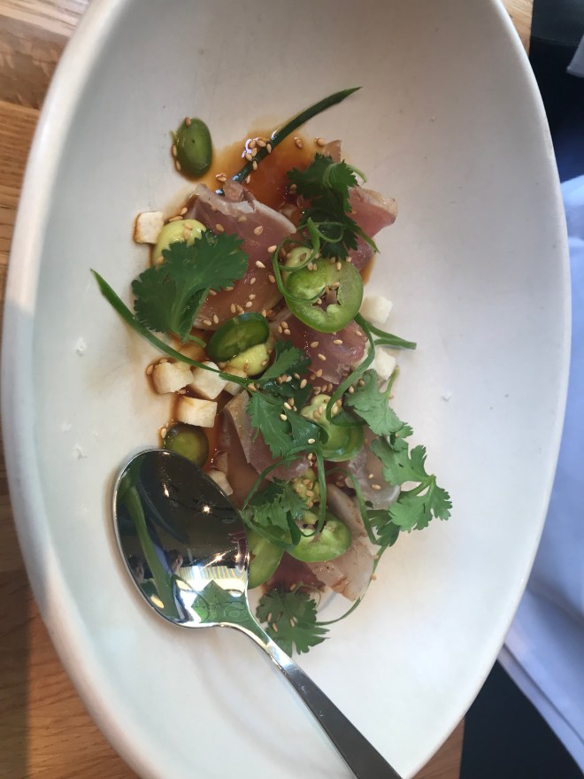 Al got the albacore tataki. He is obsessed with albacore right now, I’m not sure if it’s because he likes it so much or if it is because he just likes saying it! Interesting fact: albacore is the only one allowed to be called white meat tuna (nope, I did not know it was tuna before I googled). This tataki was good- lightly seared on the outside, raw on the inside and sitting in a yuzu ponzu sauce. Delicious!. I actually can not decide which was the winning starter, which meant we did some good sharing.