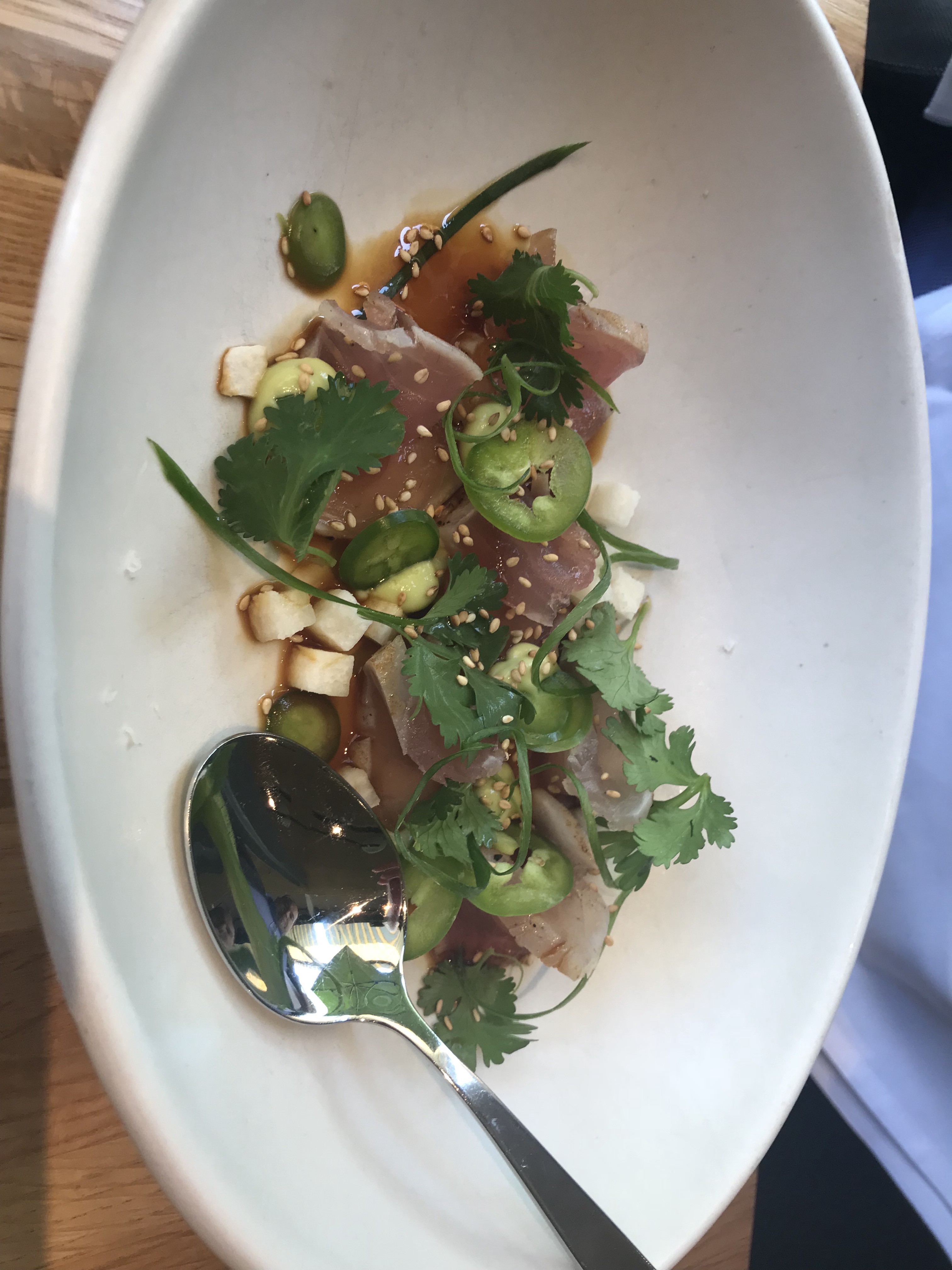 Al got the albacore tataki. He is obsessed with albacore right now, I’m not sure if it’s because he likes it so much or if it is because he just likes saying it! Interesting fact: albacore is the only one allowed to be called white meat tuna (nope, I did not know it was tuna before I googled). This tataki was good- lightly seared on the outside, raw on the inside and sitting in a yuzu ponzu sauce. Delicious!. I actually can not decide which was the winning starter, which meant we did some good sharing.
