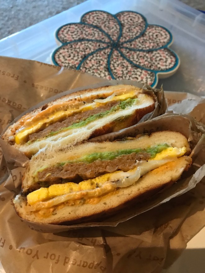 The chorizo, avocado sunrise!!! So friggin tasty. But at 820 calories a pop I really do need to start trying the other ones – practically everything else everything is 400-500 calories. It probably doesn’t help that it’s on a cheese & jalapeños bagel, my favourite bagel.