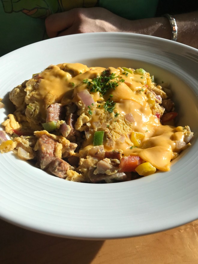 When we went together, Al decided to go with one of the rice scrambles. We had no idea what this was going to mean, but it turned out to not be particularly complicated. It’s a normal scramble with rice in it. He opted for one with I think 3 types of sausage (no surprise there). It was nice. Rice works in the scramble and eliminates the need for bread. It was super cheesy though. Something that is potentially not the smartest for someone who is lactose intolerant.