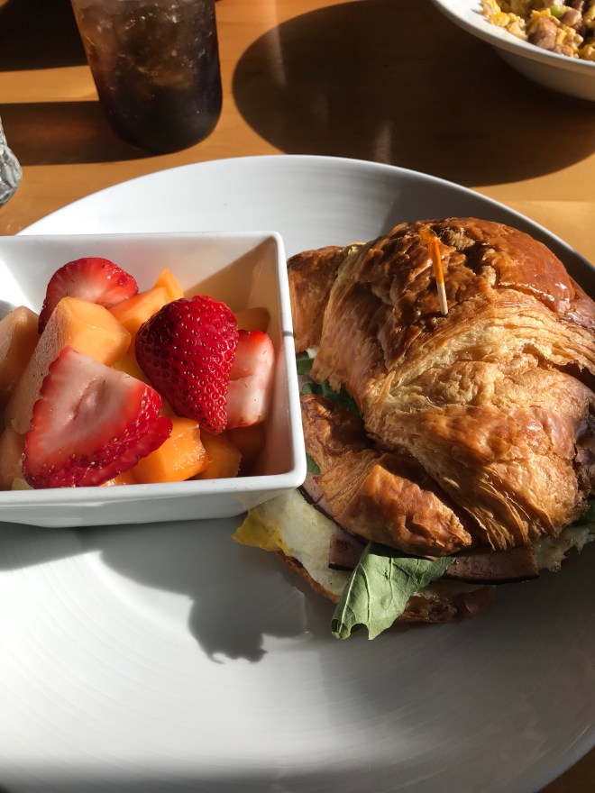 I opted for the croissant-which this time. It comes with fruit so I can call it a healthier choice. Plus I figured it would be smaller as a croissant. The croissant itself was not great, and by that I mean, it was an American style one (why do they always make them so soft & heavy) but the sandwich itself was nice. I need to remember to be more picky with croissants. The challah bread was definitely better