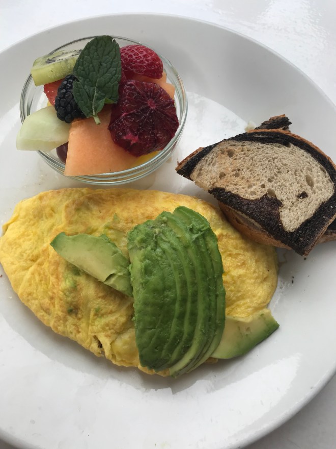 The favourite: This was a great omelette. Stuffed with goats cheese, spinach, mushroom and sun dried tomatoes. Then avocado on the side to go with it, perfection. There is a reason they call it the favourite. I went with the marble rye toast which was great. My salute to smart choices? Fruit salad on the side instead of potatoes 🙂