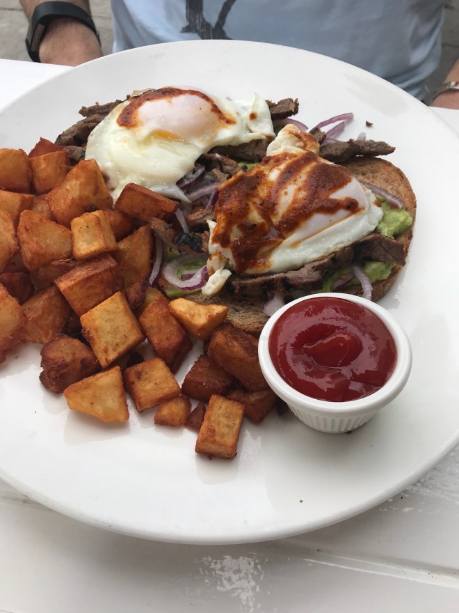 Steak and egg bruschetta: This had Al’s name written all over it. I had a taste it was good and Al couldn’t keep the happy off his face. Avocado spread on toast, red onion, eggs and steak with potatoes on the side. Obviously no healthy choices for Al but I’m pretty sure there were no regrets.