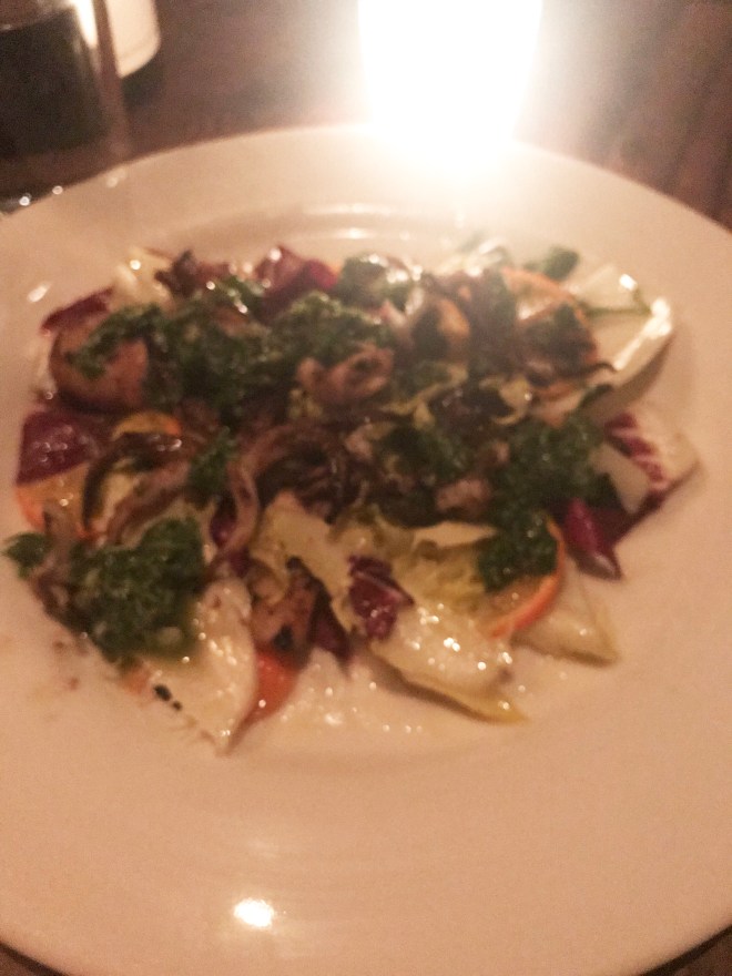 Grilled squid: yum! I love tentacles. These were done with chicory, Kumquat with a salsa verde. Really good.