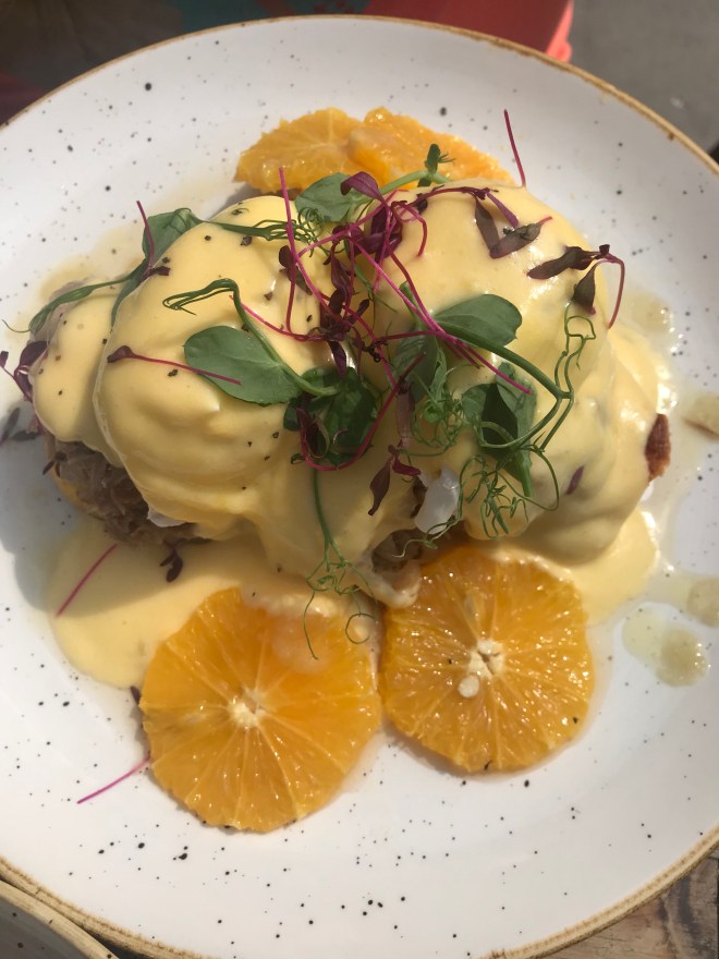 Al opted for a duck Benedict. It seems duck is having a mega moment in London right now, there’s duck food trucks everywhere as well. It was yum. Intense is probably the word. Huge amounts of duck on super dense mini bread cake things (did not look like muffins). From his belly clutching and “it keeps growing” cries for the next hour, I’m guessing he should have stopped eating a lot earlier than he did. But he doesn’t have that ability when something is yum.
