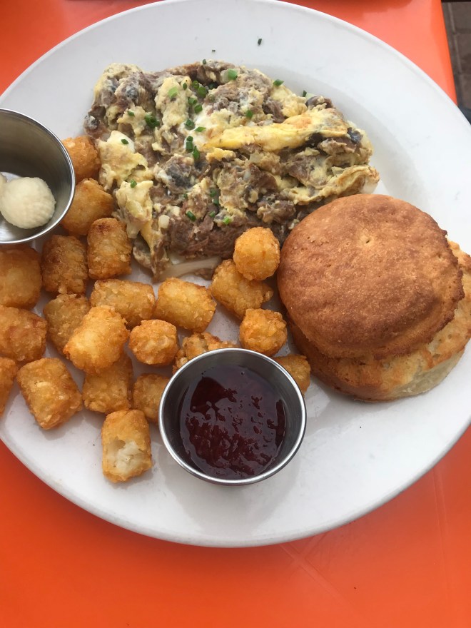 BJ’s short rib & mozzarella scramble with potato tots & biscuit. Wow! So much short rib! And so tasty. This is a great dish. The biscuits were lovely too. Light and fluffy, how they should be.