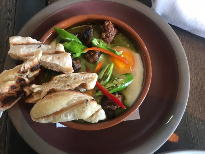 Also off the standard menu: Wood fire baked eggs in summer veg, labne & flat bread. Add the merguez, it’s 100% worth it.