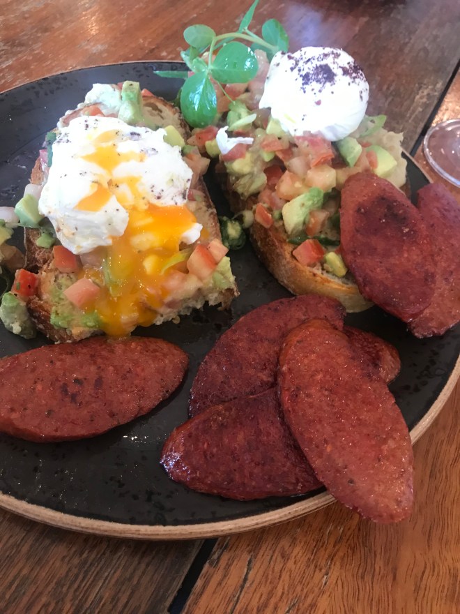 I went for the Baba Egg: babagaboush on toast with an avocado & tomato salsa topped with a poached egg. You can add bacon or secuk, my choice, obviously, was the secuk, which was a massive amount. This dish tasted amazing. Light but full of flavour. Filling, but not leaving you feeling grossly full after.