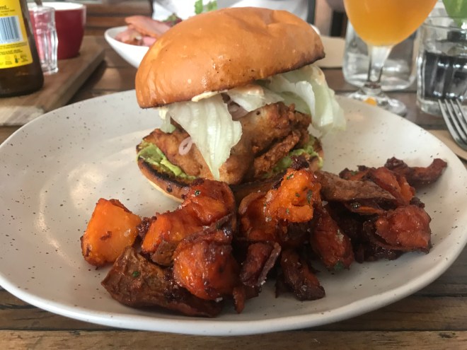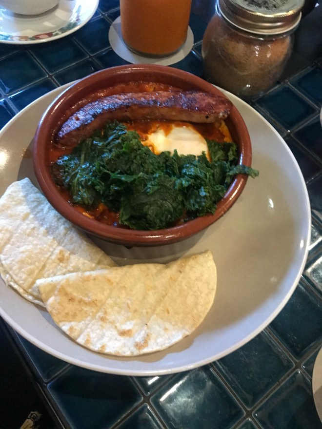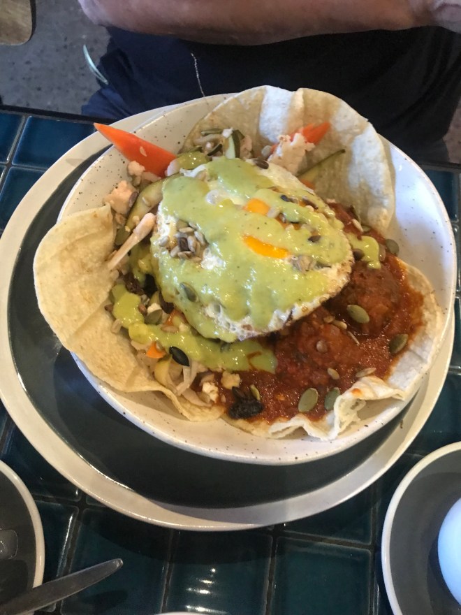 Green chilaquilles- you may know that chilaquilles is one of my favourite dishes to order, so I was really interested in seeing what happened with them in Oz (who I have seen a big increase of Latin American food with, which is awesome). So this was definitely in the category of different I would say had more of a North African taste than South American but tasty. Really good beans. It’s a vego dish and did not need meat added.
