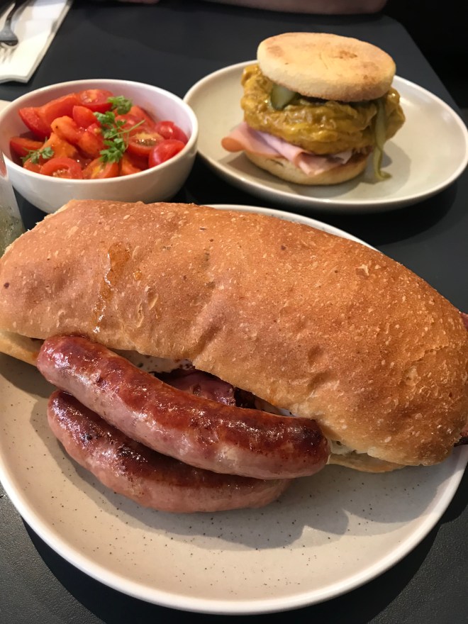 Three Blue Ducks, Bronte; after a deluge or rain ie 3 months worth in one day, Al and I escaped out for a break from the Where Chefs Eat book. It felt like it was meant to be as the rain let up just as we got out of our Uber and sipped long enough for us to walk down to Bondi after breakfast! Between us we split the fritters (yes, it’s a Definite thing, a bit like bacon & egg rolls) which I’m not sure of it cane with or we added sausage & bacon. Sausage was amazing, fritters were not to my style but actually still very tasty.