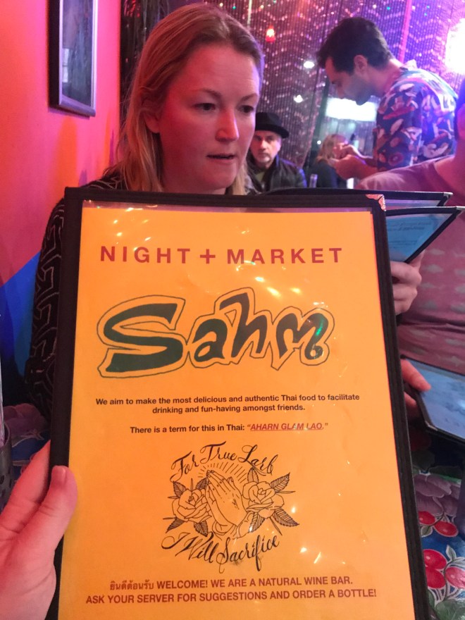 Night + Market has been worth the wait! Why did I bother waiting? Well, there’s no reservations so you need to be prepared to queue which is something Al is not generally good at. But with 3 visitors, Jax & I could not pass up the opportunity to get to taste a stack of dishes. In reward for our effort, it turned out you could put your name down and then they text you when your table is ready so you can wait at a bar!