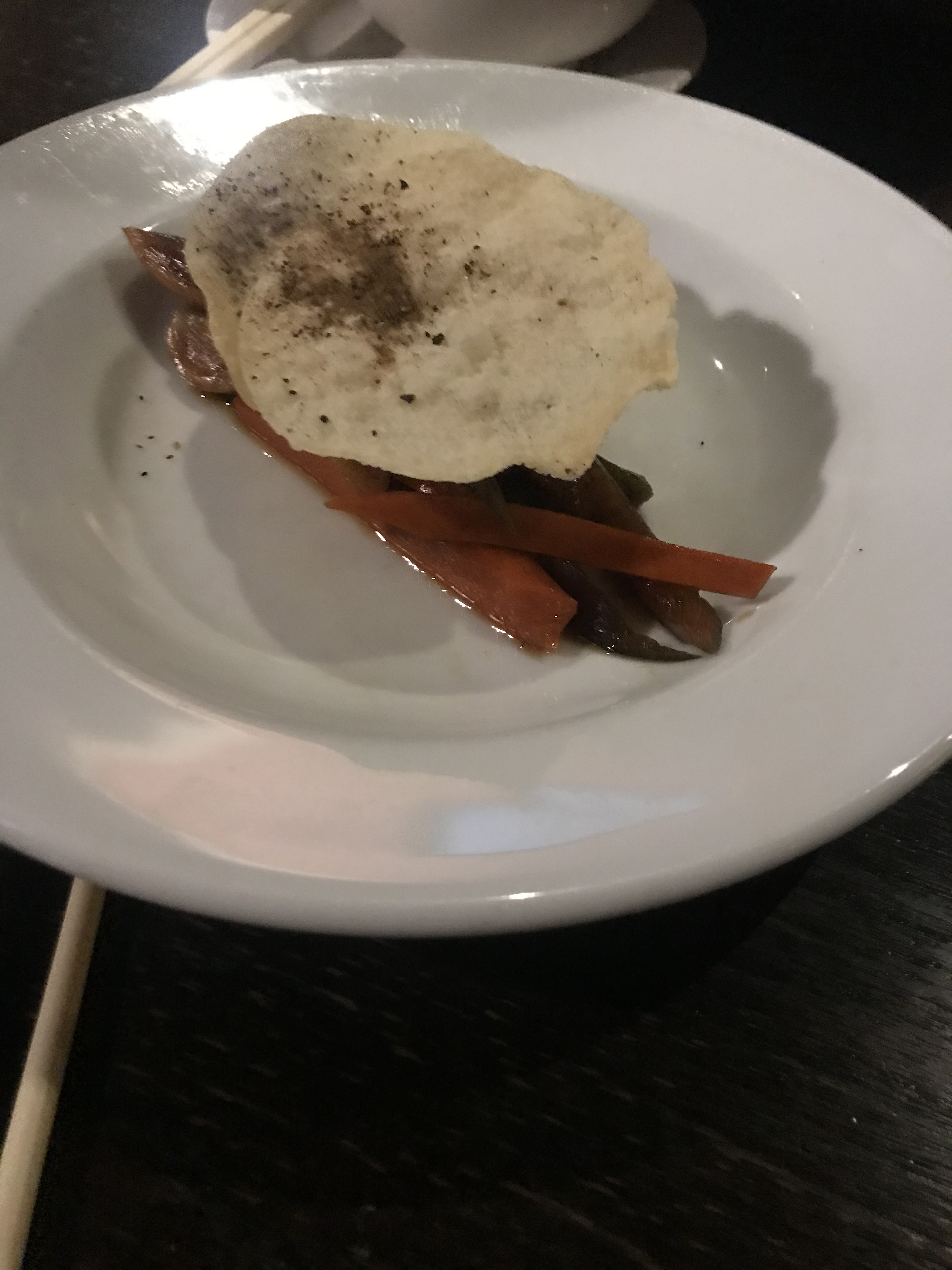 This was the dish that nearly made me say no to the chef’s menu. Not that I am against duck, I like it, and not just in the crispy pancake variety. But because it was fried, and that never seems to go down well for Jax or I. Turns out, this was probably my favourite dish of the night. Ridiculously beautiful plum broth, beautifully presented and a fry on the duck so light you pretty much could not tell it was there. Cooked to perfection. I love it when a dish comes out from nowhere and kicks you in the ass with amazingness. Now I see why our waiter said it was a dish they are famous for.