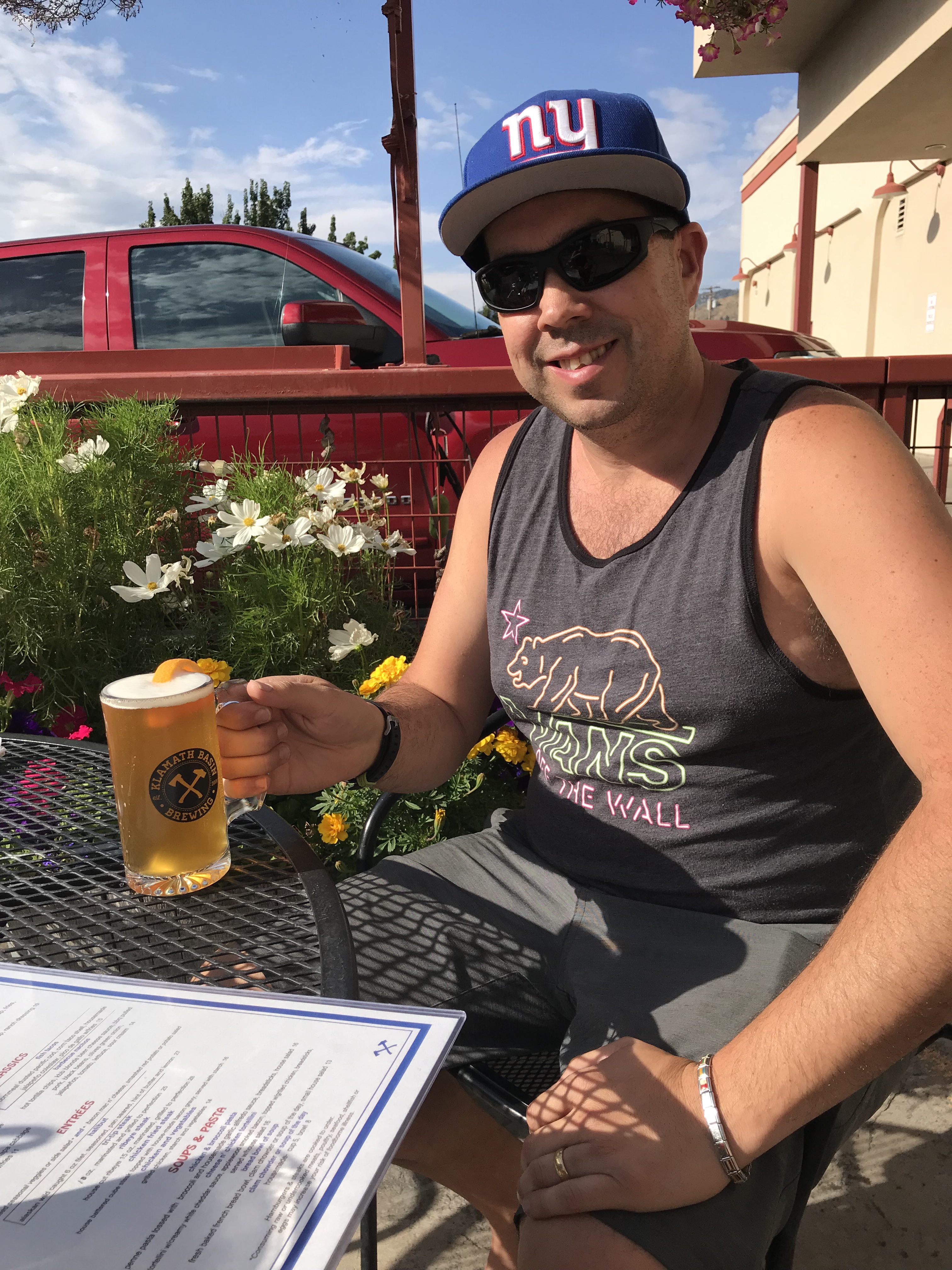 As part of our brewery tour, we headed to the Klamath Basin Brewing Company after a day of exploring. It’s a huge brewery with a massive outdoors area too. Oddly, they don’t allow dogs on the patio. The server seem to think it was an old health code rule that they hadn’t changed or a misunderstanding of the rules by the owner. Either way, it’s weird. So we had to sit at an end table and have Kevin clipped on the other side of the patio fence. He was not impressed by this arrangement.