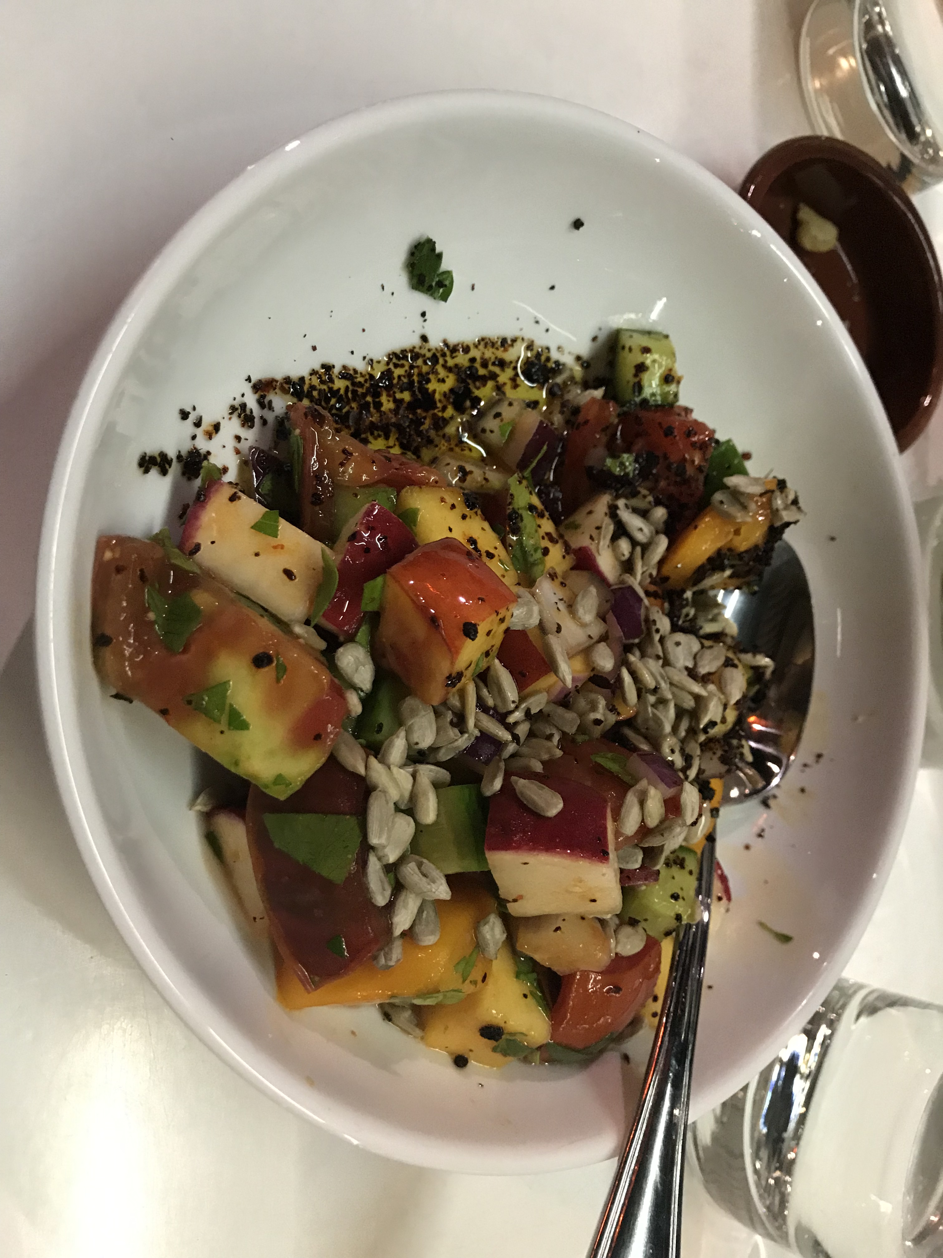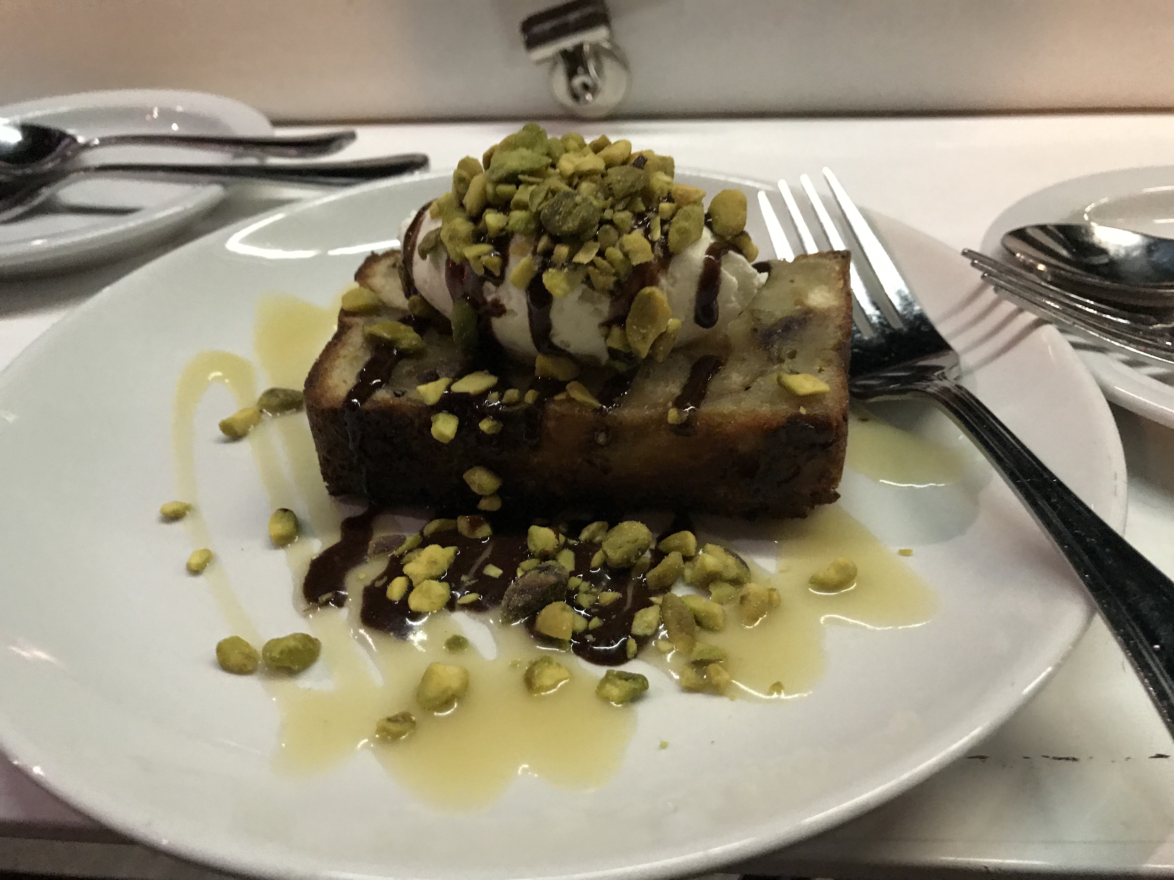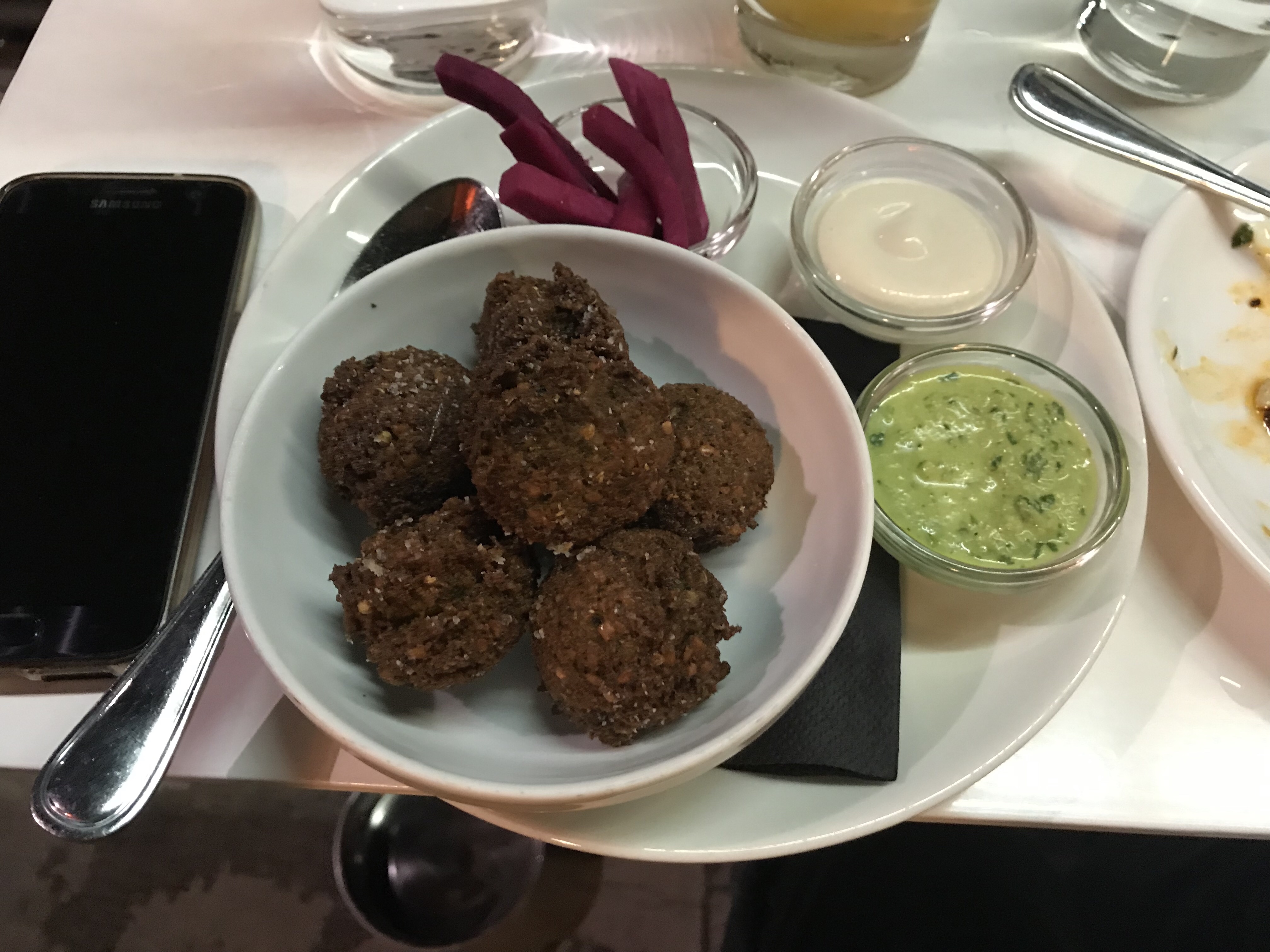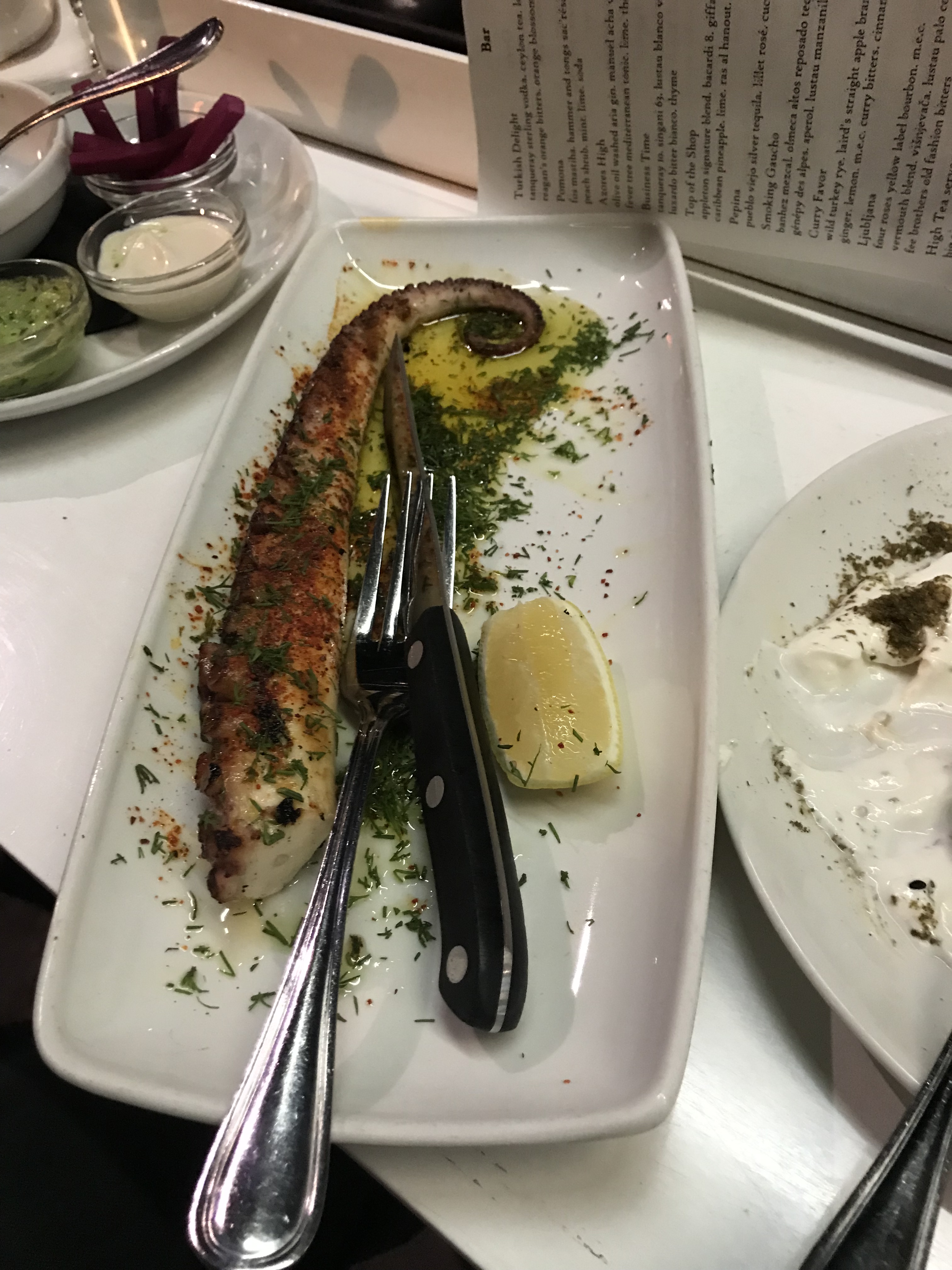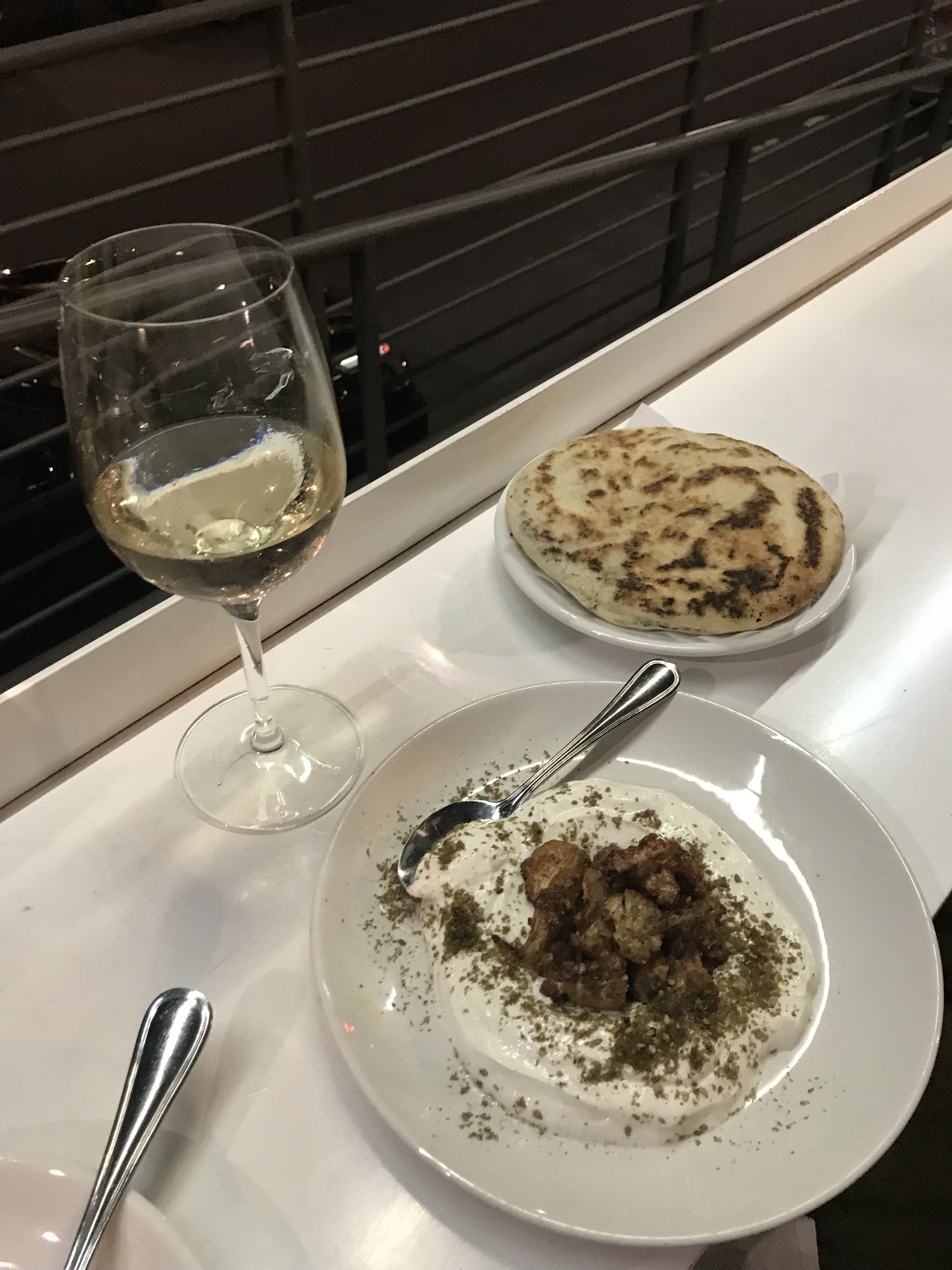 Every dish we ordered was delicious, a nice selection from Lebanon, Greece and Israel. I’ve been trying to think which was my favourite dish and I can’t pin it down. I just know it’s not the bread pudding, which was nice enough, just not what I wanted it to be. The nectarine salad was the right amount of sweet & tart and perfectly paired dressing and accompaniments. The hummus was the best I’ve had in awhile. Falafels have a good flavour and super crisp outside. Tentacles were good. Ok I think it’s a toss up between the nectarine and the falafels.