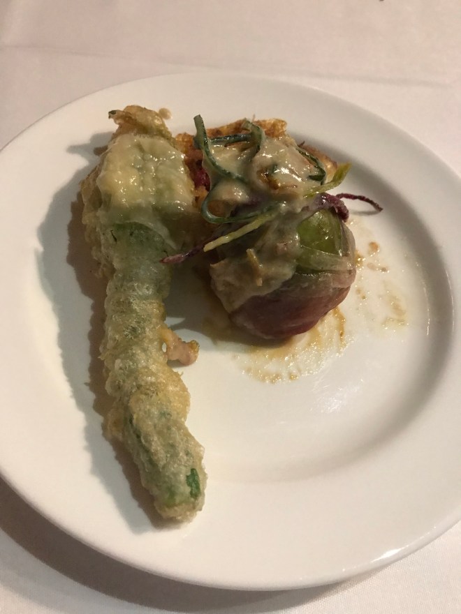 - Zucchini flowers: lightly fried and always a delight. I think I like them for the look more than the taste, but I can’t resist these either.